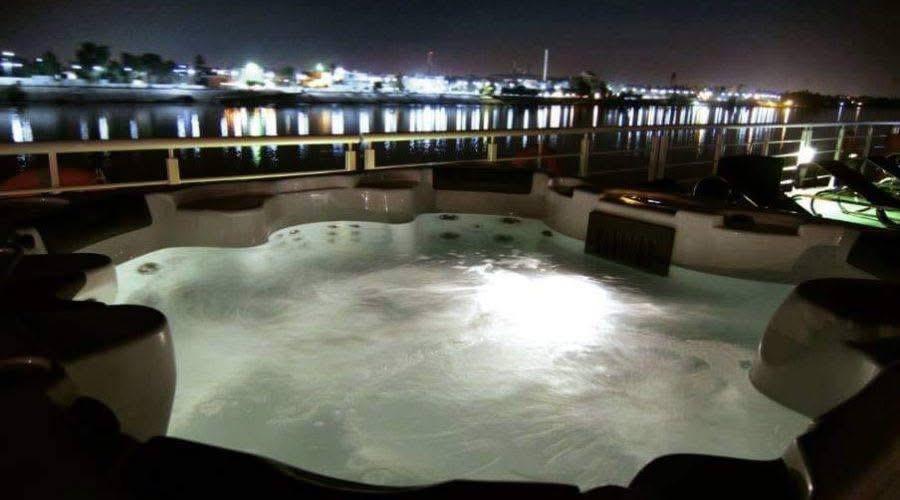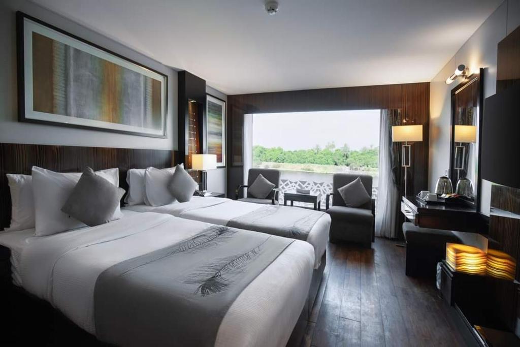 The cruise has 57 comfortable cabins with floor-to-ceiling windows so you can enjoy the beautiful Nile views. There are also three special luxury suites. Each suite comes with its own living room, dining area, and private Jacuzzi. The suites are larger than the cabins and include extra features like a flat-screen TV, WiFi, minibar, electronic safe, closets, and 24-hour room service. The design includes modern white marble bathrooms and elegant furniture, making your stay very comfortable.